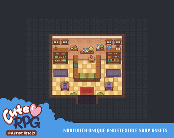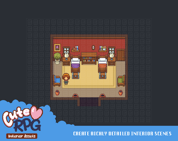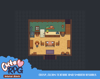 - Cottage-styled interior assets in clean, cute, art style at a 32x32px tile size- RPG character suitable for a cottage-styled RPG or farming sim with several movements and animations